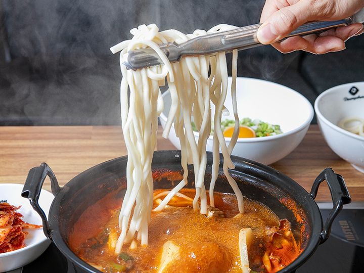 「登村(トゥンチョン)しゃぶカルグクス」は、カルグクス(手打ち麺)と、スライスした牛肉をシャブシャブで味わう全国チェーン店です。繁華街ごとにお店があるので、韓国では知らない人はいない有名なレストラン。1996年に創業して30年ほど経ち、韓国内・海外に200店舗以上かまえるブランドになりました。栄養価の高いセリやヒラタケなどが入ったヘルシーなスープと、カルグクスと焼き飯のセットメニューが、1万ウォン超のリーズナブルな価格で食べられ、しゃぶしゃぶ用の牛肉を追加注文すれば、お腹いっぱいになることでしょう!ソウルを代表する繁華街・明洞(ミョンドン)のど真ん中にも店舗があり、「明洞店」は場所柄、日本や海外からの観光客で連日、賑わっています。