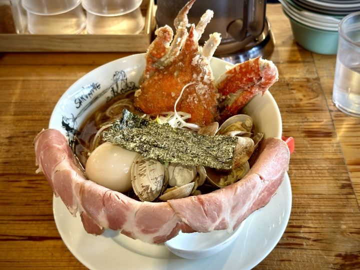 行列ができるお店で11時30分がオープンですが、10時30分頃からキャッチテーブルの遠隔でウェイティング登録しました。順番は6番目でしたが、ランチ限定10食の、渡り蟹が入ったラーメンを無事に注文できました。