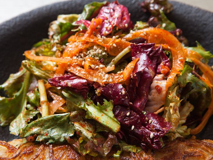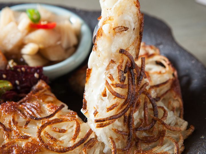 「酒有別腸(チュユビョルチャン)」はマッコリダイニングレストランで、本格的な生マッコリから、アルコール度も低く飲みやすいシャーベット状の「マッコリスラッシュ」など、お酒の種類が豊富。おつまみも、韓国料理離れが進む現代で今一度、韓国料理のすばらしさを伝えたいと独自に開発したオリジナルメニューが揃います。人気メニューは、千切りのジャガイモとチーズを焼き上げたチヂミ(ジョン)と、香ばしく焼いて魔法の粉を振りかけた豚トロの2品。どちらも「野菜がたくさん摂取できる韓国料理」本来のよさはそのままに、スタイルや味付けにお店のオリジナリティが光ります。お店は、ソウルの都心部・光化門(クァンファムン)のグルメモール「Dタワー」の4階にあります。