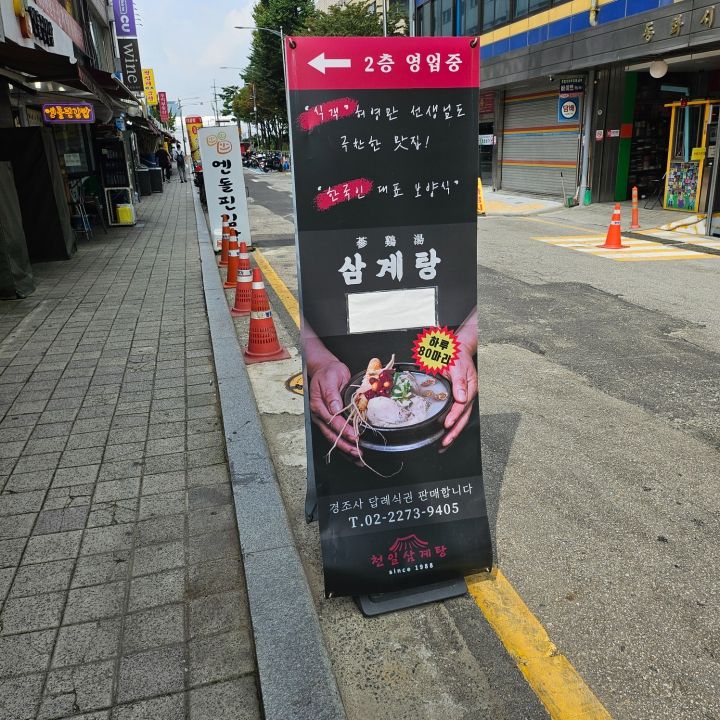 東大門歴史公園駅近くのホテルミリオレの脇を入ってしばらく進み、左側にあるお店です。写真の看板を目印行くと分かりやすいと思います。訪問した日は参鶏湯15,000ウォン、おひとり様もOKでした。ご参考に。