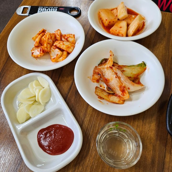 2階にある入り口を開けると、アジュンマが笑顔で迎え入れてくれました。参鶏湯とビールを注文してしばし。運ばれてきたのはキムチ、カクテキ、タマネギキムチ、味変用に塩(テーブルには胡椒も)とニンニク&コチュジャン、そして焼酎グラスに入った液体。これはなにか聞いたら人参酒!!この日は飲める人にはサービスで提供してくれて、漢方的なの香りとともに酒好きにはたまらないおいしさでした。