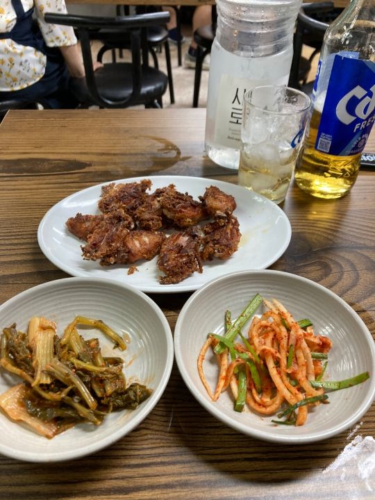 唐揚げは、カリカリで少し辛みがありますが、韓国でこのような唐揚げは初めてでとても美味しかったです