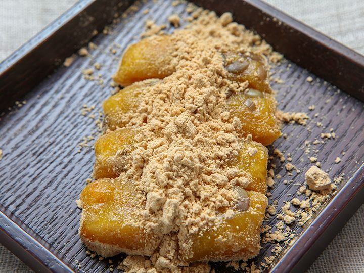 頂いたのは、オミヂャ茶とかぼちゃのきな粉餅、トックリイチゴのきな粉餅。