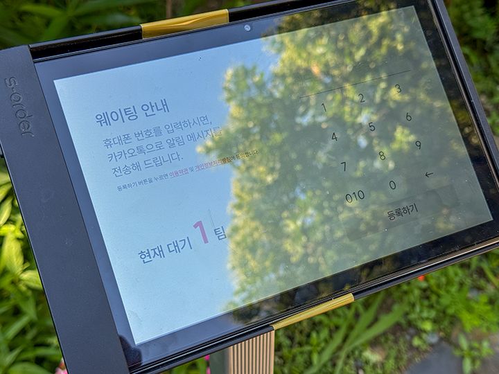 私は縁側の席に座りタッチパネルでカボチャピンスを注文しました。(現金払いのため店員さんに直接支払)