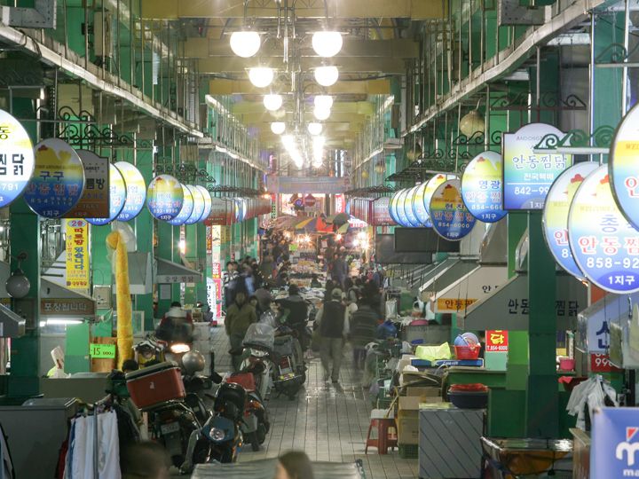 安東市内にはチンタク通り(コルモク)もあり20軒近くの老舗が軒を連ねています。外見は一般的なアーケードですが中に入ってみると70年代を思わせる内装になっています。