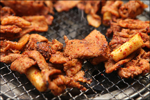 ソウル中心部の鐘路(チョンノ)で毎夜、サラリーマンや若者でにぎわうお店が「公平洞(コンピョンドン)コムジャンオ 本店」です。店名の公平洞は地名で、コムジャンオはヌタウナギという魚の韓国語です。ヌタウナギは日本ではほとんど食べませんが、焼き肉のように焼くヌタウナギ焼きをメイン料理に屋台をコンセプトにオープン。新鮮で衛生的なヌタウナギを仕入れ事前にコチュジャンにあえた切り身を従業員が下焼きして、客のテーブルに出すので、コチュジャンの赤色がついた焼き肉のように見えます。店内の壁には古い韓国映画のポスターの複製や学生の訓練用の迷彩服が張りつけられ、メニューも大きな黒板です。