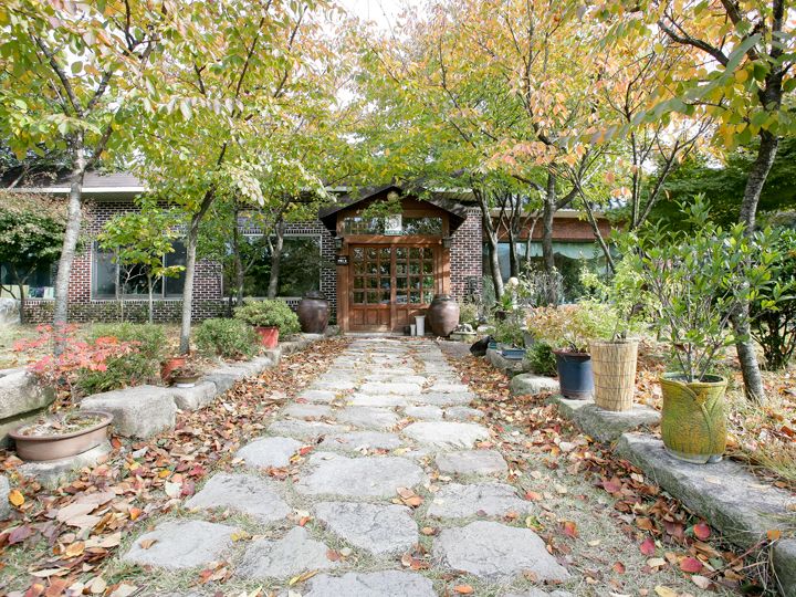 「紅柿(ホンシ)」は、慶州(キョンジュ)の家庭式韓定食(ハンジョンシッ)専門店です。一つ一つ手をかけて作られる約20種類のおかず。地域でとれた野菜をはじめとする国産食材、醤油や味噌などの伝統醤(ジャン)類、自家製の紅柿ソースや紅柿酢、海産物のダシ汁など天然調味料を使用し、手作りの味をたいせつにしています。注文を受けてから作るおかずの多さにも、店主夫婦のまごころが感じられます。慶州市内中心部にありながら、民家のような風情ある佇まいで、「柿の木は昔から韓国の民家を象徴する木、伝統の趣あるあたたかい店にしたい」という店主の思いが店全体から伝わってくるようです。
