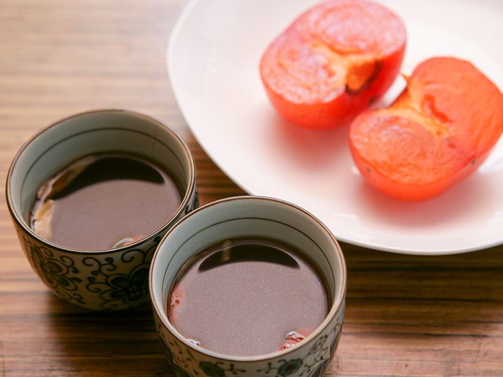 豆ご飯の後のヌルンジも美味しく頂き、デザートの冷え冷えの甘い柿と漢方茶で締め。