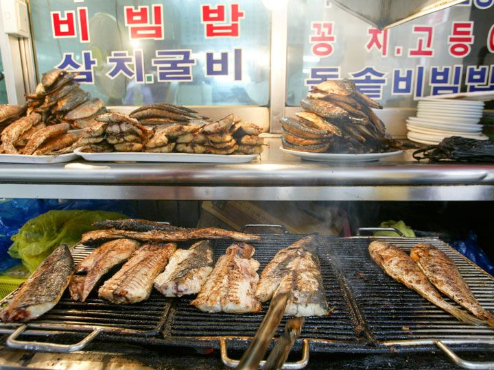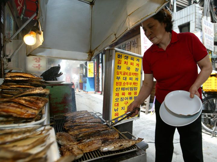 東大門に宿泊し、翌朝お粥を食べようと卸売市場あたりを歩いていました。すると焼き魚のよい香りがしてきて、店の前で焼いていたおばちゃんが「美味しいよ、食べていき」と言うので、吸い込まれるように店内に。