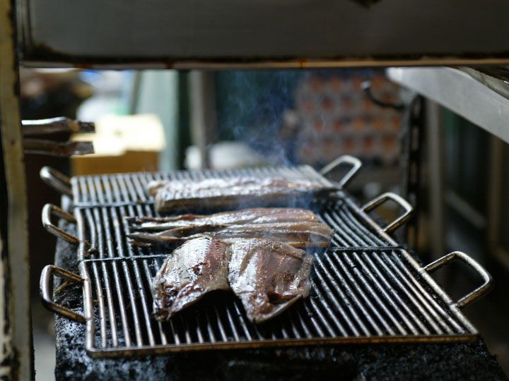 お店の前で焼くのでしょう、店先に魚がたくさん並んでいました。
