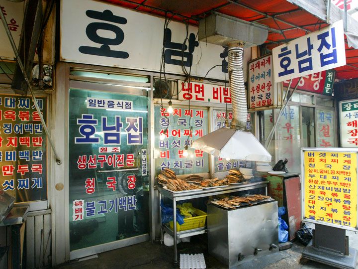 ショッピングタウン・東大門(トンデムン)の西側エリアは、タッカンマリ店や焼き魚食堂が集まるグルメエリアとしても有名です。中でも「ホナムチッ(湖南食堂)」は、1970年代のオープン以来、不況知らずの人気ぶりで、50年以上にわたって営業を続ける老舗店。ディープな雰囲気の細い路地にある店先では、サバやサワラやサンマなどの魚を、モクモクと煙を立てながら炭火で焼いている様子が見られます。炭火焼きというだけあって、脂が適度に落ち、中までほっこりとよく焼けた身はジューシーそのもの。年季の入ったお店は、おひとりさまでも入りやすい雰囲気ですが、ランチタイムなど混んでいる時間帯は合席になるので、ピークタイムを避けた時間帯の利用がおすすめです。