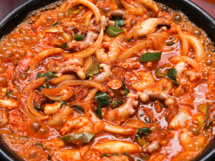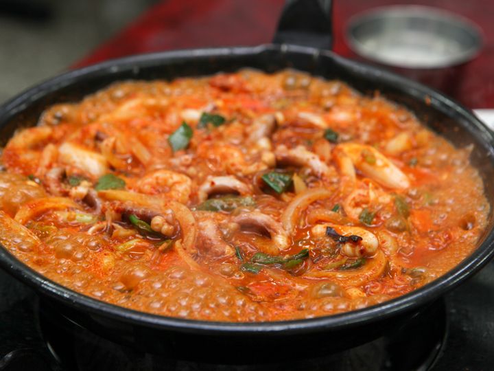 釜山名物の一つ、ナッチポックム(テナガダコの辛炒め)の創業店といわれるのが「元祖ハルメナッチ」。西面(ソミョン)エリアお隣の凡一(ポミル)駅すぐ、貴金属通りの一角で1963年より営業しています。ダシと唐辛子などで具材を炒め煮にするのがポイント。味の決め手は7種類の魚介からとった天然スープです。基本のナッチポックムのほか、エビやホルモンを加えたメニューから具を選んだら、卓上のコンロで煮込みます。ピリ辛のタコを堪能した後は、麺や炒めご飯を投入。素材の旨味を最後まで食べつくしましょう。お昼時はおひとりさま不可なのでご注意。