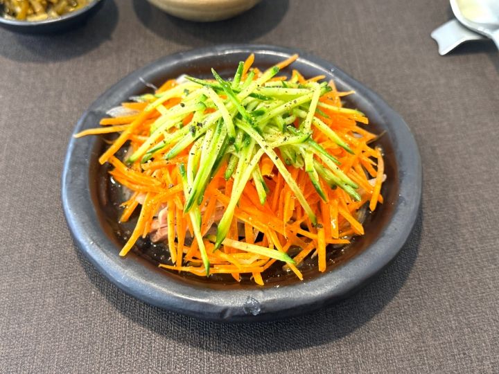 お肉の冷菜は人参ときゅうりがたっぷりで、弱めのお酢を使っているのか酸味があるので冷たくサッパリ、ヘルシーに味わえます。