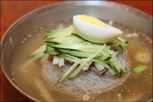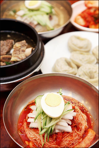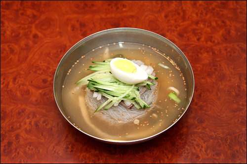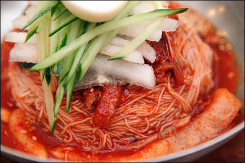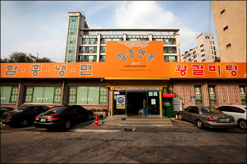 ソウル東部の祭基洞(チェギドン)にある「咸鏡麺屋(ハムギョンミョノッ)」は咸興(ハムン)式冷麺の専門店です。夏のピーク時には「咸鏡麺屋」の冷麺食べたさに祭基洞駅まで数十mの行列が出来るほど。1993年開業以来変わらない味を守りながら、良心的な値段で料理を提供しています。料金は先払いで、人気メニューはエイの刺身入り辛口混ぜ冷麺(フェネンミョン)、水冷麺(ムルネンミョン)、牛肉カルビのスープ(ワンカルビタン)です。サービスの白菜キムチ・大根キムチ(カットゥギ)、スープ(ユッス)も好評です。