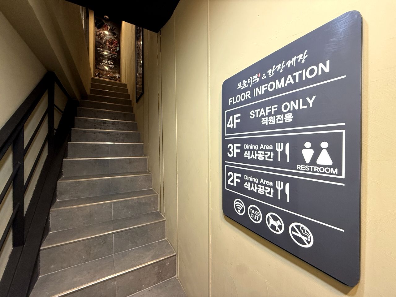 地下鉄2号線「乙支路入口(ウルチロイック)駅」方面のビル2階と3階にあり、階段で2階へ上がって入店します。2階が満席の場合は3階へ案内されます。