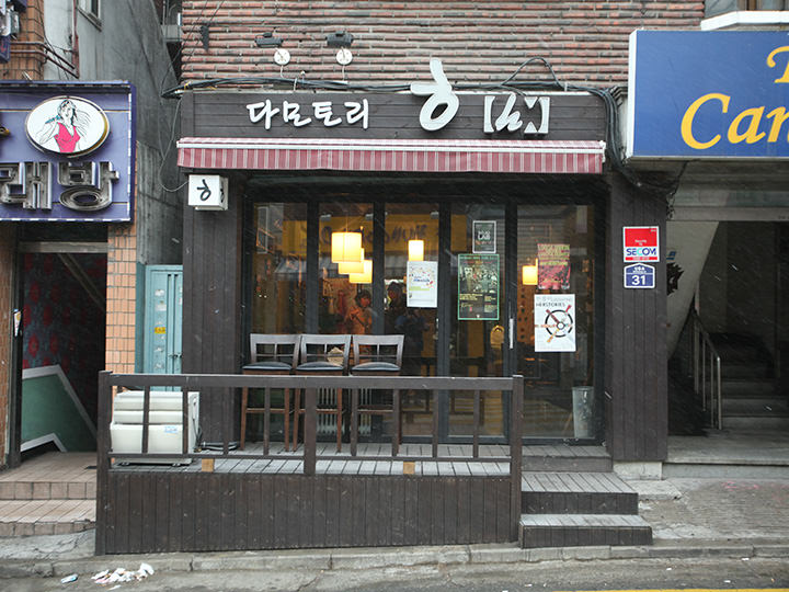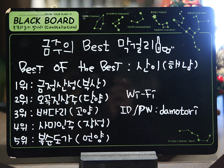 おしゃれな飲食店が立ち並ぶ坂道の途中にあり、薄暗くて落ち着いた店内です。日本語のメニューもあり(たくさんのマッコリの説明書きがされている別メニューも)、何も困らないと思います。