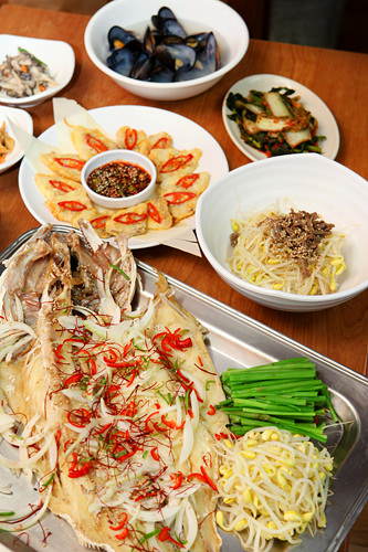 ソウルの繁華街・明洞(ミョンドン)からも近い、乙支路(ウルチロ)の下町の隠れ名店「イェジョン名家」は、ニベ(韓国語でミノ)と呼ばれる魚をはじめ、旬の魚料理や豆もやしごはんがおいしいと評判です。ニベは6月~9月に旬を迎える白身魚で、韓国では高級魚として知られており、ビタミンAやB、たんぱく質が豊富。ニベを丸ごと一尾蒸した「蒸しニベ」や、ニベのジョン(韓国風ピカタ)、店の人気メニューの「牛肉入り豆もやしご飯」などは、お酒のつまみに、子どもの食事に、またダイエット中の女性や健康を考えるお年寄りにもぴったりです。