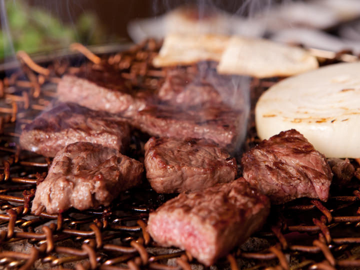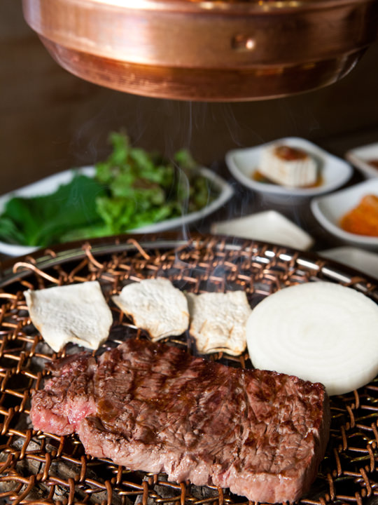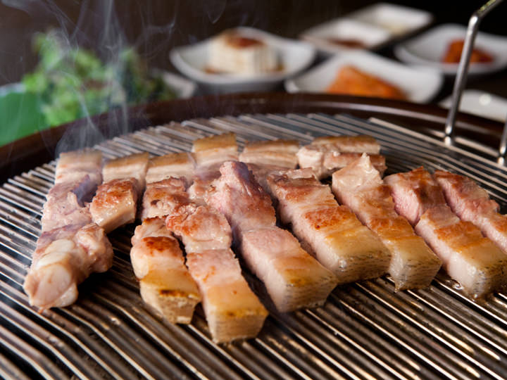 アジュモニがお肉を焼いてくださり、お肉が出てくるたびに網も替えてくださいます。