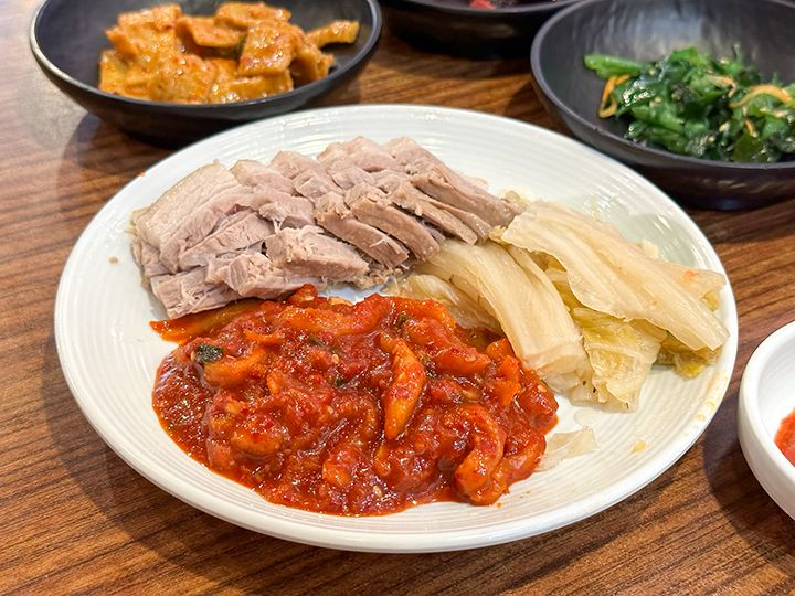 ポッサム定食を食べたのですが、キムチがおいしく、パンチャンもいろいろついてよかったです。