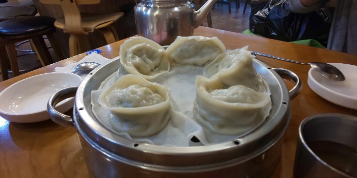 マンドゥは蒸し器に載って登場。アツアツほくほくのマンドゥはニラがたっぷり入って美味しいです。冷たい麺とのバランスも最高!ミルミョン名店の人気メニューを堪能しました。