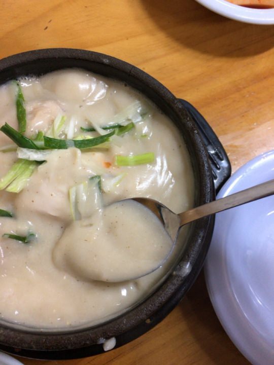 またしばらくしてから参鶏湯が登場!スープはまさにシチューの様な色とトロトロ加減。アツアツで頂くと、意外に味は薄味なので自分で塩・こしょうで味の調整を行います。でもこってりしていて、鶏肉もホロホロと柔らかく、とってもおいしい。えごまの味はそれほど感じられませんでした。量が多いかなと思いましたが、ほぼ完食できました。 -