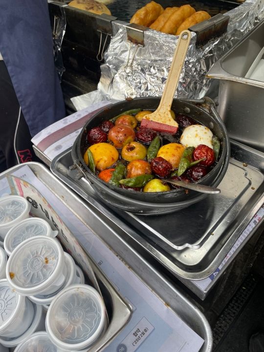 黒蜜がたれてくるので火傷に注意。顎にかかりましたw 具はそんなに入ってなかった。昔どこかで食べた黒蜜ホットクは味付けされた木の実がゴロゴロ入っいて美味しかったのでその記憶で食べたが少し違った。どこのだろうー。ブロックタイルの地面を歩いた記憶。。近くに小さな川が流れた河畔があったかも。