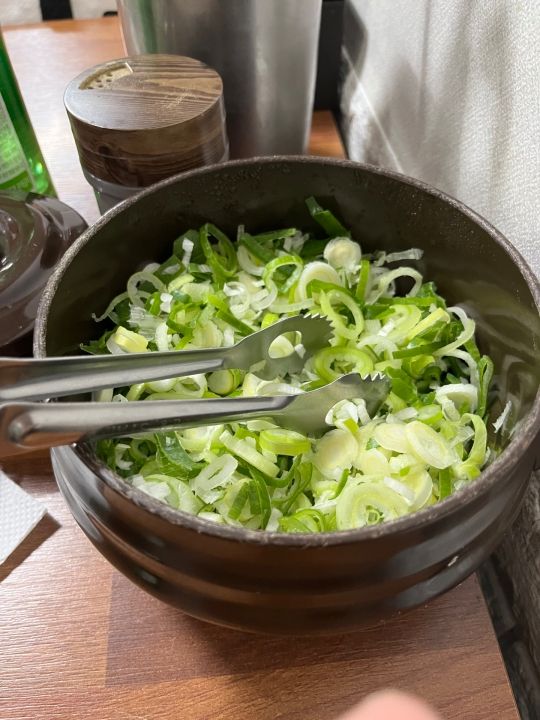 ソルロンタンに備え付けのネギをたっぷり入れ、一口スープをすすります。