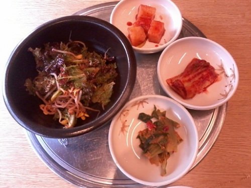 大き目のサンチュサラダやカクテキなどのおかずも美味しく、石鍋のため