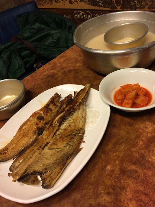 前出の方も書いてらっしゃるように、席につくと自動的に洗面器に入ったマッコリとホッケが出てきます。