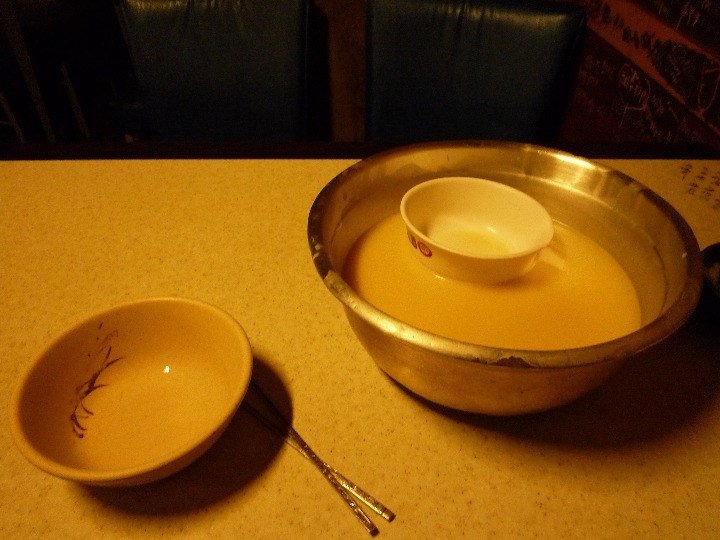 お店に入って席に着くと 洗面器(!?)に入ったマッコリ登場