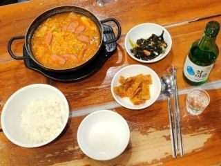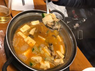 めっちゃ寝ちゃってる子もいるし、早く帰って寝りゃ~いいのに W、と思いつつお目当てのプデチゲ(部隊鍋)を注文。