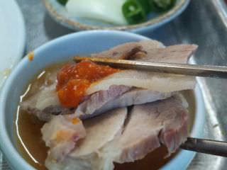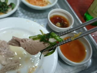 ・スユッを何もつけず食べるとやわらかく、臭みなく、肉のうまみが少し感じられる。