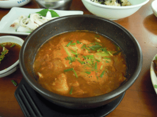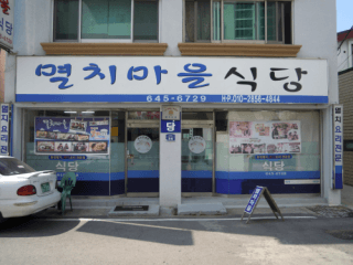 場所は港町統営の街中、統営観光ホテルの裏手になります。商店街の一角に白と青の基調のこざっぱりとした店の外観であります。中はテーブル席と数席の座敷席思ったより手狭です。時間帯がずれていたせいでお客さんはいなくご主人と奥さんは座敷席でお休みしてました。(笑)