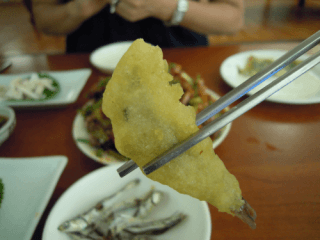 続いて出てきたのはミョルチティギムとミョルチフェです。ミョルチティギムはしっとりとしていてカリカリ感はそれほどでも無いです。韓国の天ぷら特有で日本に比べるとどっしりとした感じです。でも中にはしっかりミョルチが入っていてイワシを食べてますって感じになっていいです。