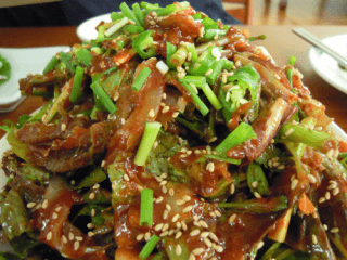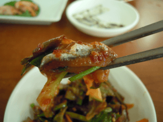 今回のメインのミョルチフェはイワシの刺身にネギや数種類の生野菜をヤンニョムで和えてサラダ風になってます。麗水のソデフェと似ています。しかし酸っぱさはなく、辛さの中にも入っているミョルチが逆に何とも言えない甘さを出しています。非常にさっぱりとしていて心地よい辛さが口の中に残り、そこにミョルチフェがよく合って本当においしい食べ物です。格安のイワシがこんなにおいしいなんて!!って思える一品です。