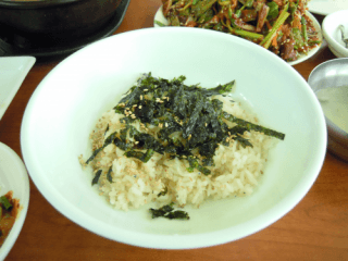 そして最後にミョルチパッが運ばれてきます。ご飯の上に海苔がかかっており、よく見るとご飯の中にはじゃこがまぶしてあります。しかもただの白米では無いようで、少し黄色がかっている事から何かのだし汁で炊き込んだご飯と思われます。手が込んでいます。このミョルチフェにはミョルチチゲとミョルチテンジャン(味噌汁風)が付いてきます。これで一人前15000wです!!!!なんとお買い得なことでしょう。