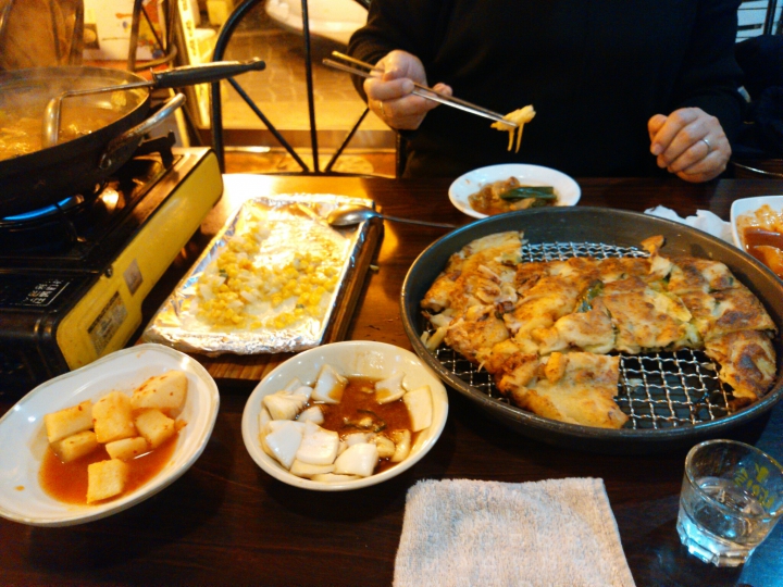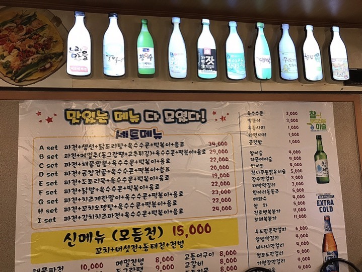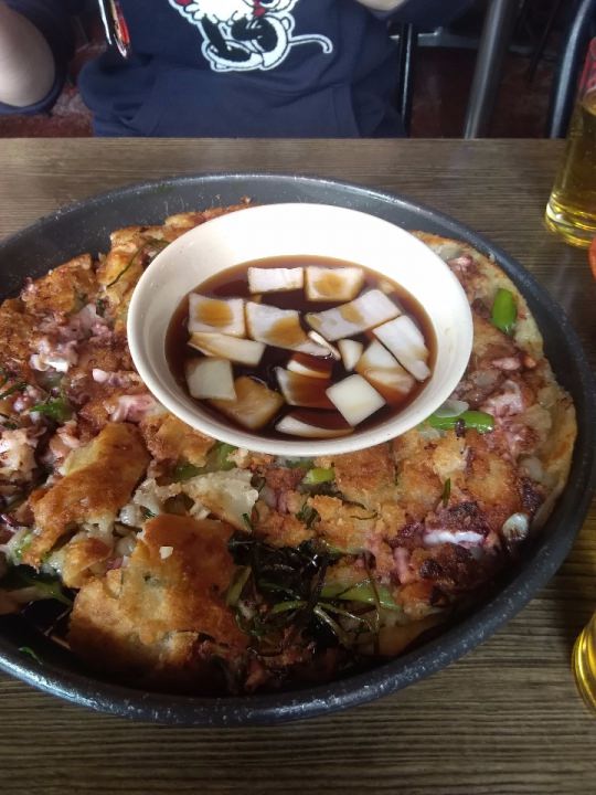 ヘムルパジョン(9000won)と、瓶ビール(4000won)頼みました。チヂミの厚さはほんとに分厚くて、でもサクサク軽いので二人でペロリと平らげました(o^-^o)イカゲソとネキがたっぷり!安くてうまい!本場のチヂミ食べたい方、ミョンドンの観光客相手に出しているようなペラペラの高いチヂミなんて食べないで欲しい。ミョンドンからもタクシーで千円くらいで来れます。電車だと少し面倒なので。