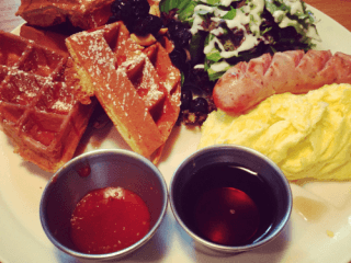 スクランブルエッグ、ウィンナー、ワッフル、サラダがセットになったものを2人でシェアしました。