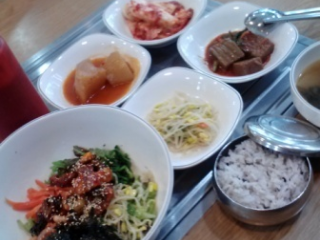 一人での昼食にはウナギスープ(7000ウォン)かウナギビビンバ(8000ウォン)が良さそうなので、ビビンバを注文。ウナギ石焼ビビンバ(9000ウォン)というのもあるようですが、近くの席で食べている人を見たら湯気がモウモウと出ていて暑そうだったので、普通の方にしました。