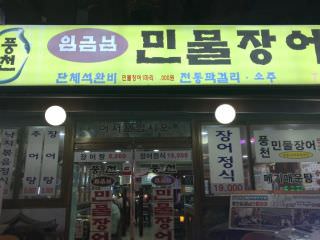 店名は「ミンムルチャンオ(淡水ウナギ)」ですが、店の前の水槽にはナマズもいて、チュオタン(ドジョウスープ)もメニューにあるので、この3種の淡水魚を出すようです。