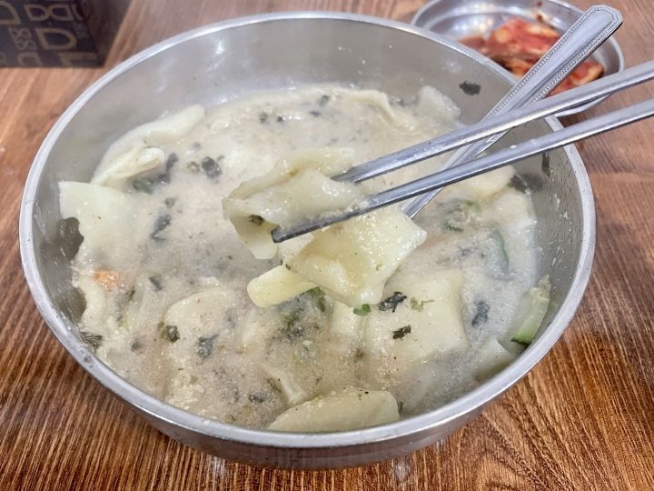 運ばれてきてすぐはかなり熱いので、舌などを火傷しないように、気を付けながら食べます。マイルドなスープに、もちもちのスジェビが良くあいます。そのまま食べてももちろん味が効いていて美味しいですが、スジェビとキムチを一緒に食べるのも素晴らしき組み合わせでとっても美味しいですので、オススメです。 -