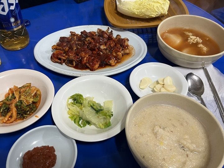 私は、定番のチュクミグイとビール、ソジュでの夕食です(最近はソメッで飲むことが多いです)。オカラスープで口直ししながら美味しくいただきました。辛さに慣れてしまったのか、テンチョ(青唐辛子)チュクミにれすばよかったかな?