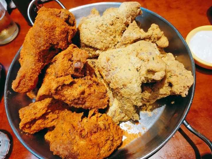 ハーフ&ハーフ、お腹が空いていたらいけるかもしれませんが、小腹が空いた時にの2人では食べ切れなかったのですが、残ったチキン、持ち帰りもできました。 -