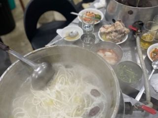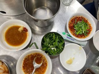 タレの調味料を各種持ってこられましたが、正直作り方が分からずそんな気配を感じたのか、店員さんが作りながら教えてくれました。ニラを入れてタレを作るのがこの店の特徴ですね。至れり尽くせり!エプロンも貸してくれました。一通りたべて、うどんを追加。この注文も隣に座っていた日本語が話せる学生さんが、店員さんに注文を手伝ってくれました。ビールを一本飲んで、合計18000W。