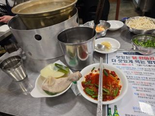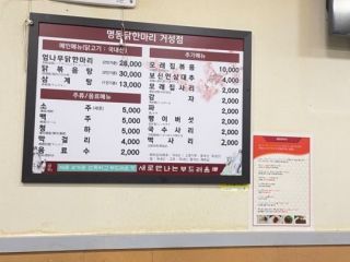 一人前(パンマリ)とネギとエノキタケと焼酎はチャムシルと〆カルグクスで計22,000ウォンでした。美味しかったです。エノキタケやネギも中々ボリュームありました。お腹いっぱいでしたが、つい〆のカルグクスを一口でも食べたくオーダーしました。食べ過ぎ&飲み過ぎ!でも凄く満足しました。有難うございます。 -