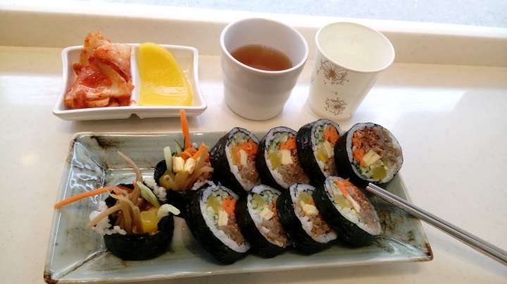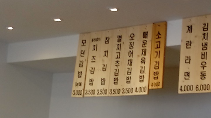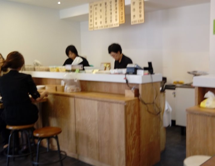 会計は先払い、「水、具無しスープ、タクアンとキムチ」はセルフサービスの淡々とした接客ですが、無愛想とか冷淡ではありません。なお、最近の人気はチーズキムパッ(フィラデルフィアと断り書きあり。3500ウォン)と牛肉キムパッ(4000ウォン)、卵ラーメン(4000ウォン)のようでした。