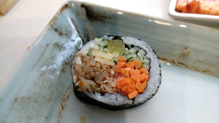 外観は最近トレンドの「具沢山系」で、ここのオジンオチェは、乾したオジンオ(イカ)をカツオブシのような状態に加工して味付けしたものでした。以前に別の味のキムパッを食べた時は、コンニャクのような謎のプヨプヨ具材が入っていましたが、今回は入っていませんでした。