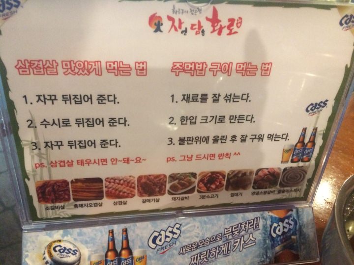 メニューはカルビやオギョプサル、サムギョプサル、ソコギと一般的なものが色々そろっています。私は牛カルビ、サムギョプサル、カルメギ(豚バラの脂のない部位)を注文しました!
