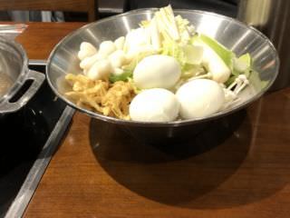 鍋は備え付けのダシを入れて、あとは自分で取りに行くタレを入れて辛さの調節をします。辛さは唐辛子の絵の本数でわかります。そこに自分の好きな具材を入れて作ります。