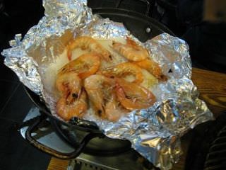 いう味で美味しかったです。そして貝の後はエビ!鍋の上にアルミホイル、
